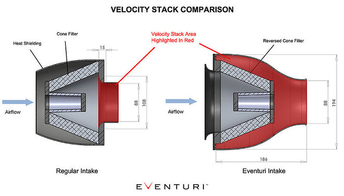- JAK TO DĚLÁ EVENTURI? Naproti tomu sání EVENTURI používá obrácený kónus (obrácený hřib) a samotný airbox se tak stává propojovacím dílem mezi filtrem a sací trubicí. Prvkem, který tak udává tok nasávaného vzduchu není filtr samotný, ale právě patentovaný karbonový airbox Eventuri. Tento airbox je navíc vyroben z karbonových vláken (PREPREG karbon), které mají perfektní tepelně izolační vlastnosti a zaručují tak, že nedochází k nežádoucímu ohřevu nasávaného vzduchu. Proudící vzduch má tak pro nasměrování do sací trubice k dispozici celý objem airboxu a nedochází k brzdění vzduchu nebo nežádoucím turbulencím. Specifický tvar airboxu navíc vyvolává "venturi" efekt, kdy je vzduch tvarem airboxu přirozeně urychlován a směřován přímo do motoru.