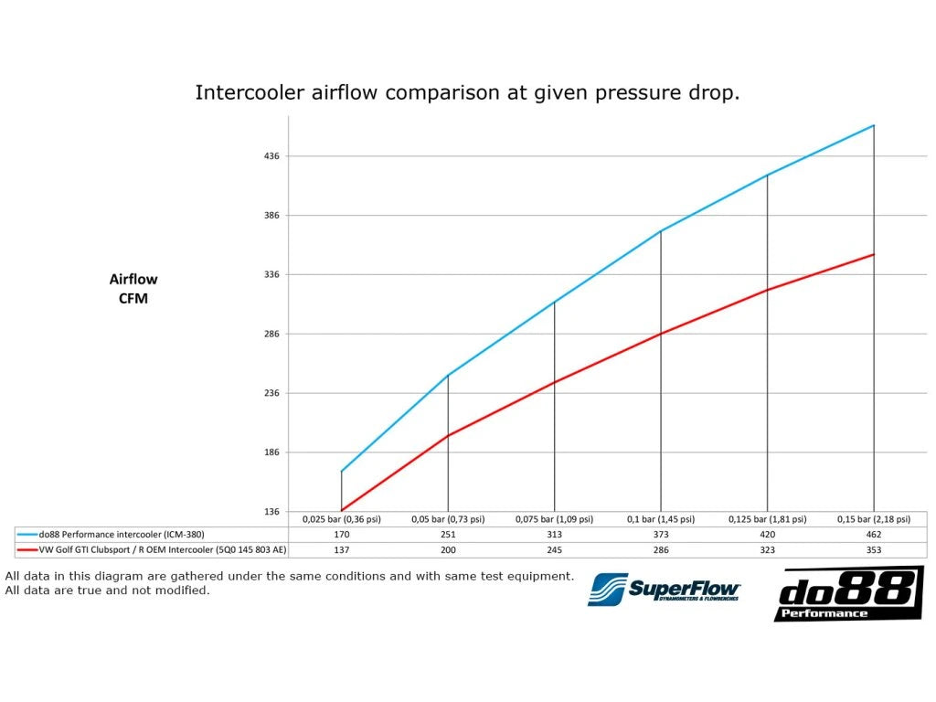Zvýšení objemu jádra o 75 % je úspěch, na který jsou v do88 hrdí. Je to pozoruhodný rozdíl, který je citelný. Motor lépe reaguje v celém spektru otáček a zvládá opakované plné zátěže bez přehřívání. Mylná představa, že intercooler je třeba upgradovat pouze po velkém ladění motoru, je mezi zákazníky a automobilovými nadšenci stále rozšířená. Během horkých letních dnů a při opakovaných zrychleních, sportovní jízdě nebo dokonce při běžné jízdě v horkém klimatu, není pro motor těžké generovat nebezpečně vysoké teploty nasávaného vzduchu – dokonce i u standardního, neladěného vozu. Chladicí kapacita s OEM intercoolerem je v mnoha případech nedostatečná, což ovlivňuje výkon. Teplo musí být eliminováno, jinak se slibovaný výkon sníží, jakmile přidáte plyn. S tímto intercoolerem máte jistotu, že výkon bude vždy k dispozici.