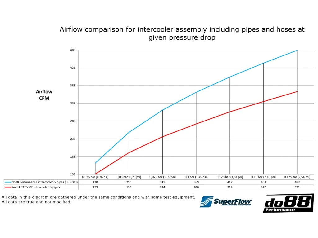 Součástí BigPacku je také sada charge pipe do88, navržená tak, aby doplňovala a zlepšovala výkon intercooleru do88. Originální charge pipes mají několik neefektivních ohybů a nejsou optimalizovány pro výkon. Naše charge pipes jsou nejen větší, ale také plně optimalizované pro proudění vzduchu, což zvyšuje průtok o 31 % oproti originálu!