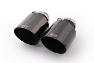 Sada 2 ks nerezových koncovek Ø 102 mm s šikmým řezem v ČERNÉM LESKLÉM provedení. Logo REMUS je zde ve zkrácené podobě "R" vygravírované (laserem vypálené) "zlatým" písmem a vytváří tak stylový kontrast.