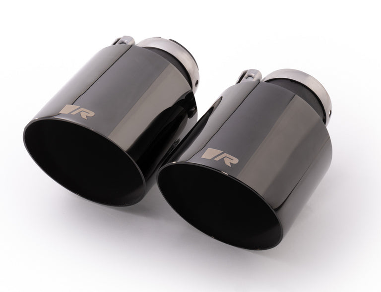 Sada 2 ks nerezových koncovkek Ø 115 mm s šikmým řezem v barevném provedení ČERNÝ CHROM. Logo REMUS je zde ve zkrácené podobě "R" vygravírované (laserem vypálené) "zlatým" písmem.