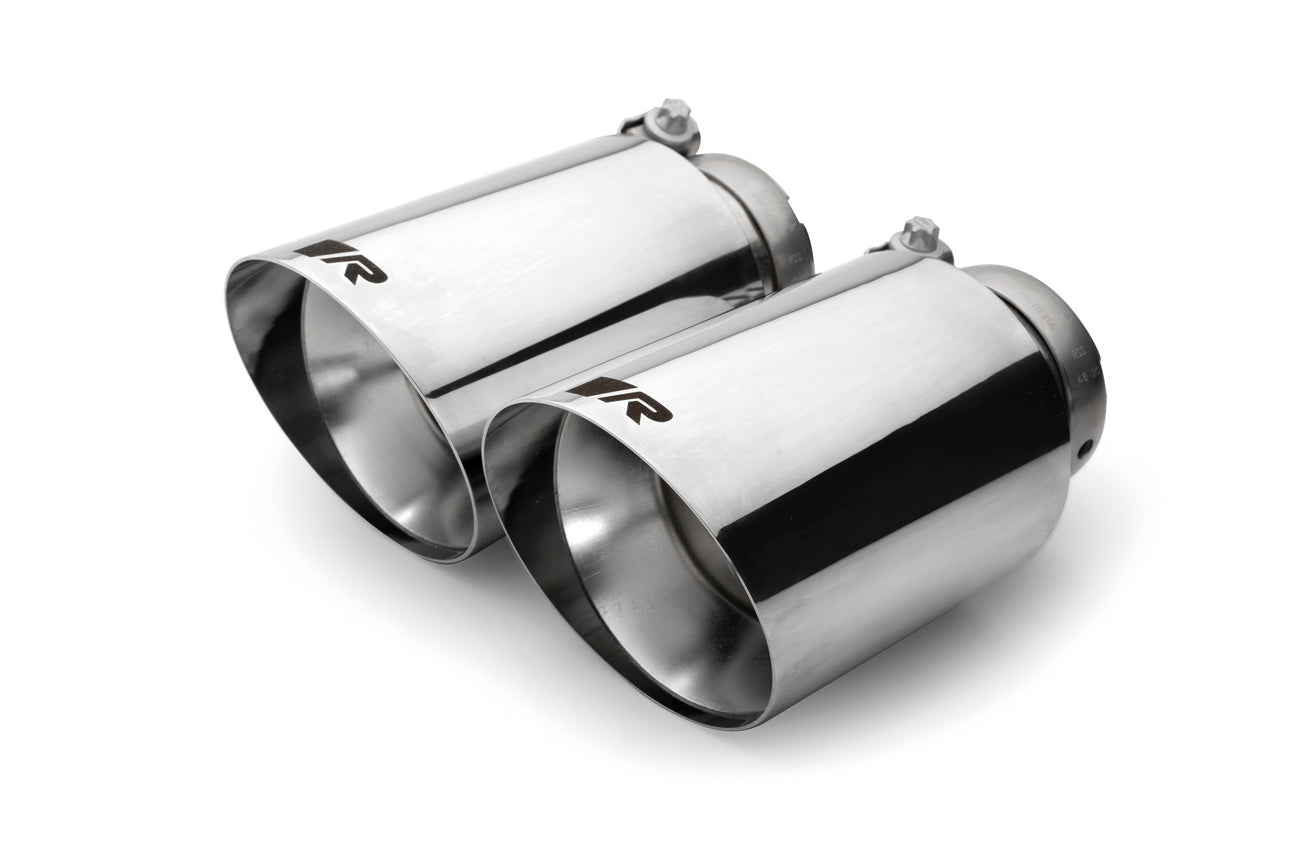 2 ks CHROMOVANÝCH NEREZOVÝCH koncovek s Ø 102 mm. Šikmý řez s ostrým okrajem. Možnost regulace polohy v podélném směru i sklonu pomocí sférické spony. Unikátní řešení pro vaši individualizaci finálního vzhledu.